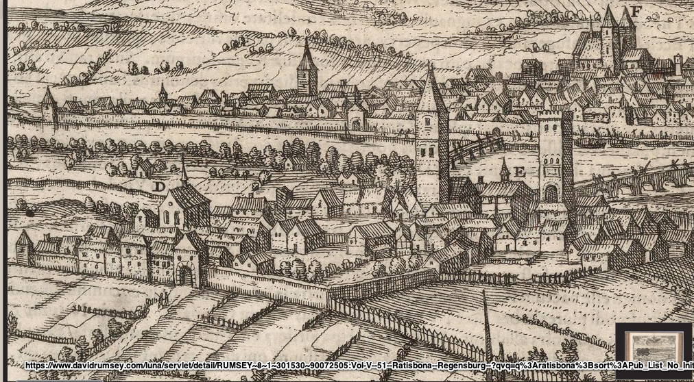 Es ist tatsächlich eine Ansicht von Steinweg aus, und die Details stimmen. Es gab damals einen Stadttor-Turm am Nordausgang von Stadtamhof; der höchste Turm dahinter (in der Mitte des Bildes) ist der "schwarze Turm", der nördlichste der drei Türme der Steinernen Brücke, links sind St. Mang und ganz links der Andreasstadel, rechts im Bild ist die Spitalkirche St. Katharina. Der kleinere Turm in der Mitte war mir zunächst unklar - wahrscheinlich ist es der südliche Brückturm (siehe weiter unten). i